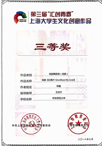 日前,由上海市教卫工作党委、市教委举办的第三届“汇创青春”——上海大学生文化创意作品展示活动在上海举办,共包含视觉传达、数字媒体艺术、动画、戏剧舞蹈、音乐艺术等九大门类,自2016年以来连续开展三届,旨在大力推动上海高校创新创业教育,为全市文化创新和创意产业发展营造优良环境。挂靠在华东师范大学国际汉语文化学院团委的学生社团镜双语话剧社原创话剧《红枫叶Goodbye, My love》报名参加了第三届“汇创青春”上海大学生文化创意作品评选。经过剧组的排练、准备后,录制节目效果视频交由组委会审核,最终获得本次大赛戏剧舞蹈类(戏剧)三等奖。