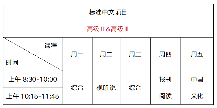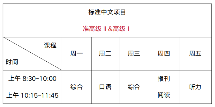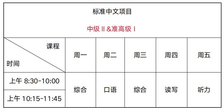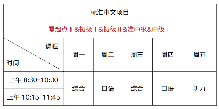 零起点Ⅱ及其他非零起点:周一至周五上午8:30-10:00,10:15-11:45,每周20课时(1课时=45分钟)