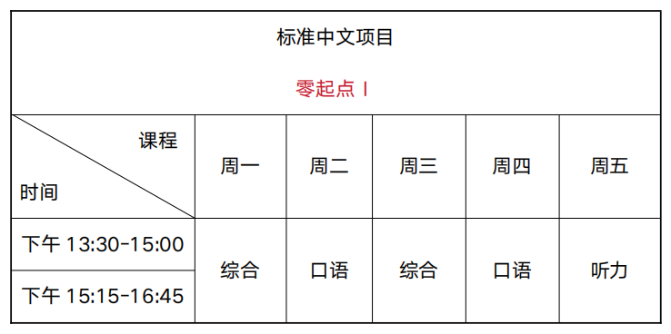 零起点Ⅰ(完全零起点):周一至周五下午13:30-15:00,15:15-16:45,每周20课时(1课时=45分钟)